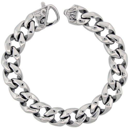 Stainless Steel Large Cuban Curb Link Chain Bracelet w/ Fleur De Lis on Clasp, 8.5 in.